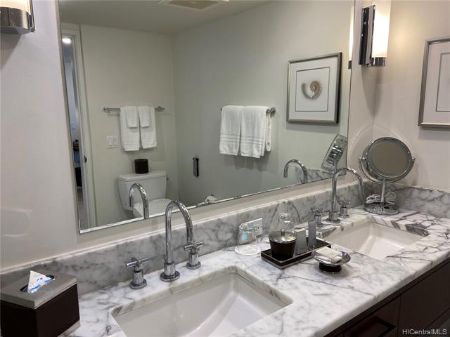 バスルームはカウンターも床も大理石で贅沢。高級感もさることながら、10年経っているとは思えないよい状態がキープできているのも高級ホテルコンドミニアムならでは、よいものを使って作っているからです。