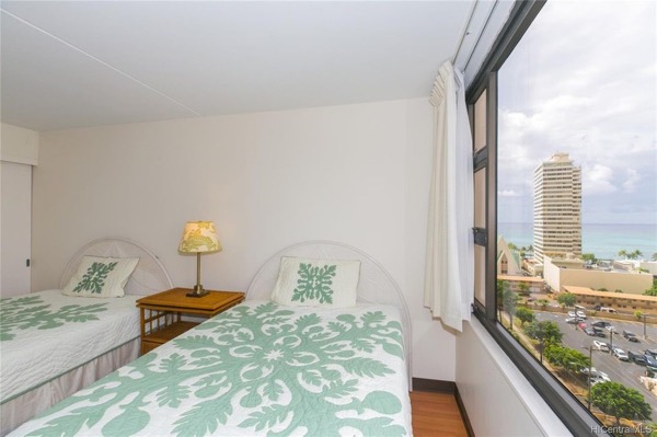 ベッドルームは、大きなベッドを2台入れてもまだスペースに余裕のある広さです。窓からはワイキキビーチの景色を楽しめます。
