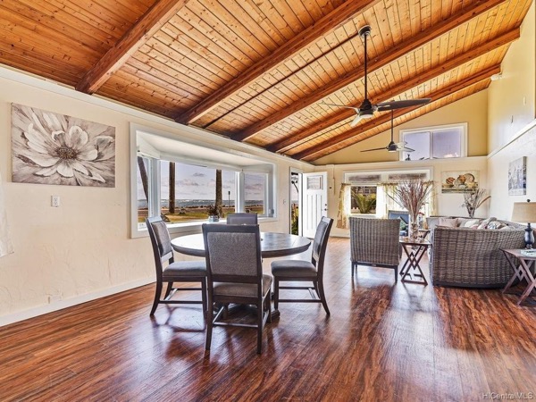 間取りは至って単純で、海に向かっている家の半分にリビング・ダイニング・キッチンとキッチン奥に一部屋が、山側のもう半分のスペースに残りのベッドルームとバスルームが割り振られています。風も光もよく通る作りになっており、木の目が美しい勾配天井から下がるシーリングファンが何ともハワイらしい空間です。