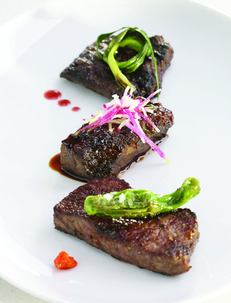 『エスクァイア』誌のジョン・マリアニもアメリカのベストステーキと絶賛した一皿が初めてワイキキで楽しめる。店の薦める“ししとうの炒め物”と“ 黒豚バラのスモーク” に合わせた “ビルカール・サルモン” のふくよかなロゼは、前菜から肉まで通して飲むことも可能。2人で1本くらいしか飲めない人はシャンパンかワインかで悩むところだが、これならどちらの魅力もカバーしてくれる1本だ。