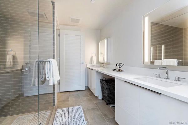 二つの洗面台と深めのバスタブがついたラグジュアリーなバスルームがついており、例えばセカンドベッドルームにゲストが泊まったとしても、マスターベッドルームの扉を閉めてしまえばお互いのプライバシーを守ることができます。