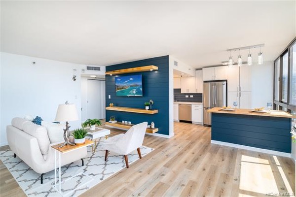 ユニットに入るとまずあるのが、広いダイニングリビングエリア。白壁の中に一部ハワイの美しい海を思わせるディープブルーのアクセントウォールが取り付けられおしゃれな雰囲気です。