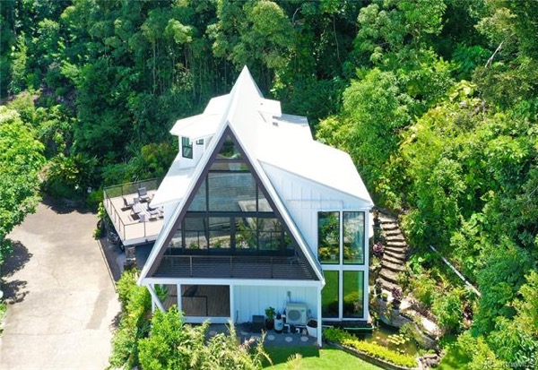 ハワイの深い緑の中に白い屋根が映えるこちらの住宅があるのは、観光客にも人気の「マノアの滝」がある自然豊かなコミュニティ。ホノルル北部の森林保護区マノア渓谷内にある閑静な住宅街です。ローカルにも愛されているモーニンググラスコーヒーやいかにもオールドハワイらしい緑の木造商業施設のスターバックスなどゆったりとした時間が流れるエリアです。また、ホノルル市内の中でも良く雨が降る地域として知られ、頻繁に虹が出現する「虹の街」でもあります。