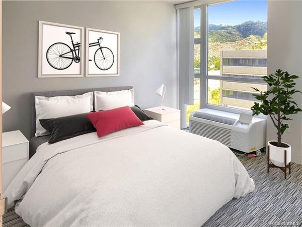 LDK脇のベッドルームの一室。エアコンの室外機がユニット内に付いているタイプなので、お部屋を少し狭くしてしまいますが、その代わりコンドミニアムの外観はスッキリ。