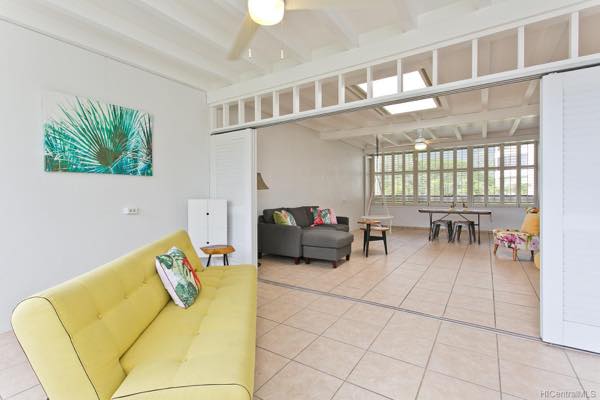 リビングエリアの先にはラナイ(ベランダ)があり、植栽の緑越しに心地よい風が室内に流れ込みます。