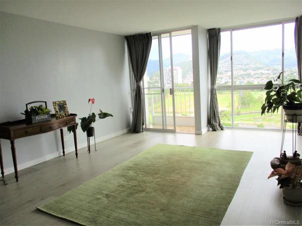 窓の外には、アラワイ運河、ゴルフ場、そしてマノア渓谷などホノルル山側の景色が広がっています。