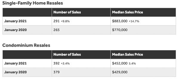 販売数は291戸で前年同月比で9.8%上昇。中間価格は$883,000で、2020年1月の中間価格が$770,000であったことと比較すると、一年間で実に$113,000も中間価格が上がっている。