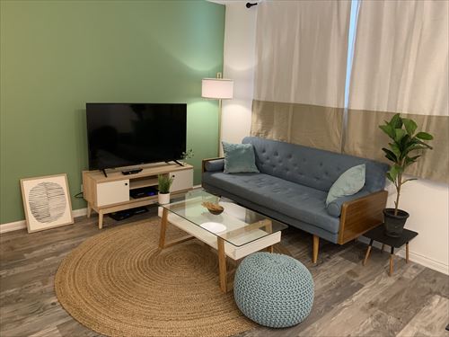 壁は塗り替えてフレッシュなグリーンに。ミッドセチュリーモダン風の家具を新しく導入。また写真映えがよくてメンテナンスが楽な、ビンテージ風ウッドプリントのビニールフロアに。