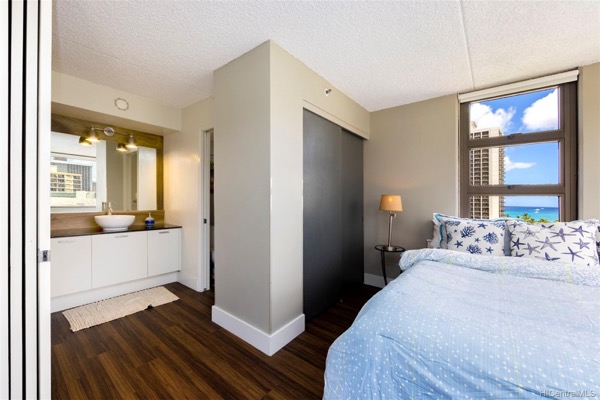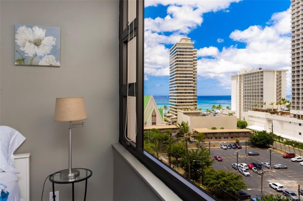 こちらはベッドルームの様子。コーナーユニットなので2面に窓があるのが素晴らしいですね。目覚めるとすぐにワイキキの海が見えるなんて、とても贅沢な体験です。
