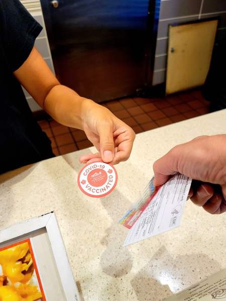 確認が取れたら下の写真のような「Covid-19 Vaccinated」というステッカーを手渡された・このステッカーは見えるところに貼ったり、手元に保管しておく。