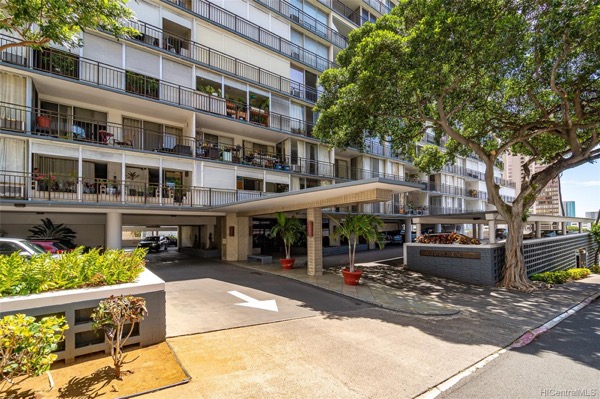 高速道路のH-1を空港からワイキキ方面に向かって走っている途中で、山側に現れるこのモダンな佇まいのコンドミニアム。周囲には似たようなコンドミニアムが立ち並んでいますが、一線を画すおしゃれレトロな雰囲気は際立っています。