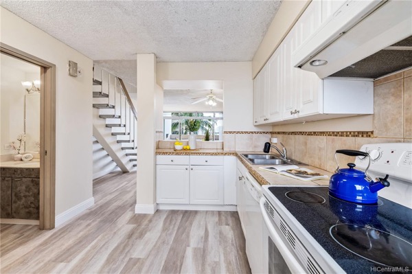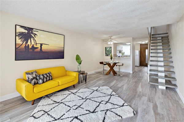 室内面積はラナイ(ベランダ)まで含めて約114㎡と広々。この広さで60万ドル台です。下階にリビング・ダイニング・キッチンとバスルーム、上階に2つのベッドルームともう2つのバスルームがある間取り。