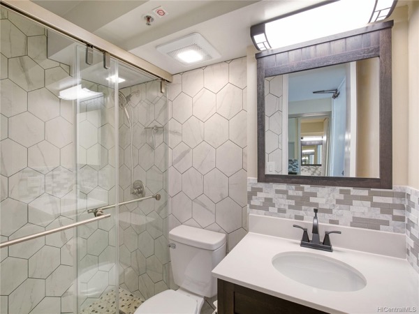 こちらがフル改装済みのバスルームの様子。大理石調のハニカムタイルがおしゃれですね。