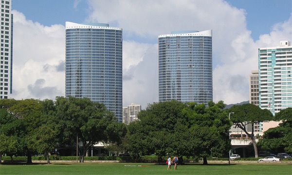 ホノルル中心を東西に走るカピオラニ大通り沿いに、アラモアナセンターからダウンタウン方向に向かって歩いていくと、楕円形をしたユニークな2本のタワービルが見えてきます。