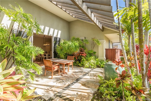 こちらがその中庭の様子。トロピカルな植栽に囲まれたパティオはアウトドアダイニングセットを置くのにぴったりのスペースです。