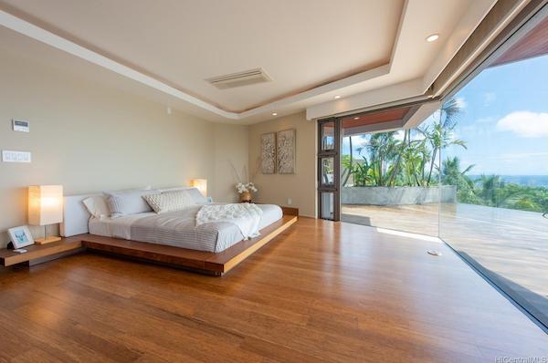 さて、この邸宅にあるベッドルームは5つ。リビング・ダイニングと同じフロアには、まず一つ目のベッドルームスイートがあり、お部屋からは直接ラナイに出ることも可能。
