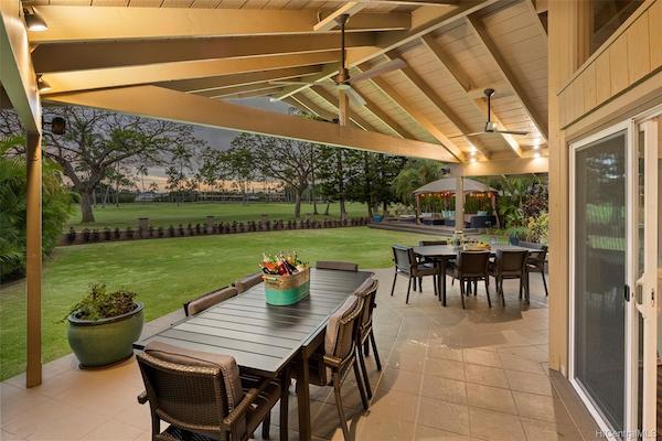 パブリックスペースを一歩外に出ると、広大な屋根付きラナイがあり、アイランドダイニング&リビングスペースとして活用することができます。