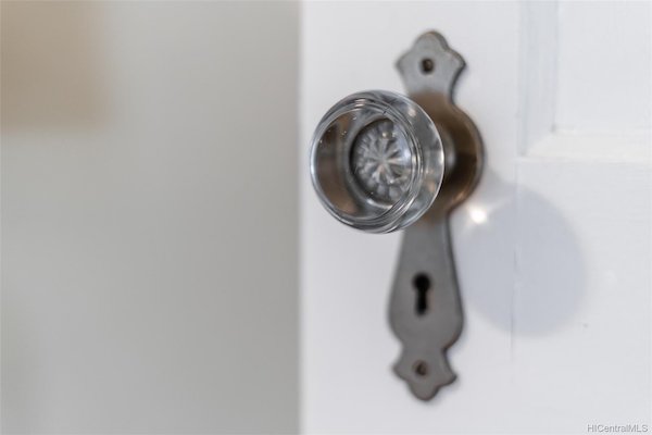オリジナルの窓、ドア、ガラスのドアノブ、天井のクラウンモールディング、象眼細工の堅木張りの床など、心奪われるディテールがオールドハワイの雰囲気を醸し出しています。