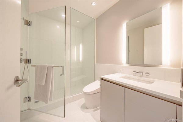 こちらは玄関を入ってすぐのところにあるバスルームの様子。シャワーのみですがフルバスなのがいいですね。トイレはTOTOのNeorestにアップグレード済みです。