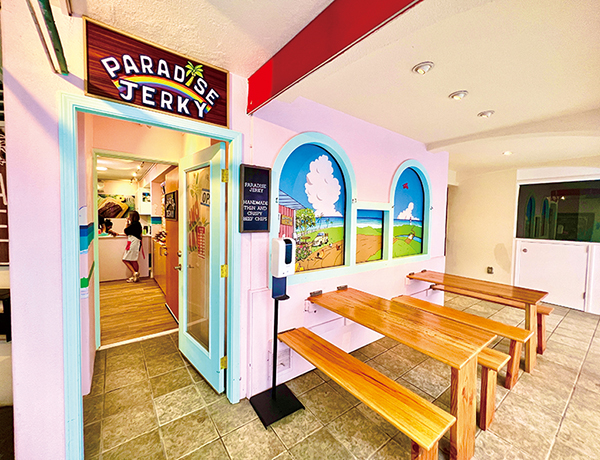 ローカルの間で知る人ぞ知る「幻のジャーキー」と言われているパリパリ食感のビーフジャーキーがワイキキに進出。極薄の手作りジャーキーは一度食べたら忘れられないと話題。先代の引退とともにその技を引き継いだのは若き日系人のヒロさん。2日以上の工程をかけて手作りする。黄色いパラソルが目印だ。オリジナル、和風、スモークペッパーなどフレーバー各種($20)。