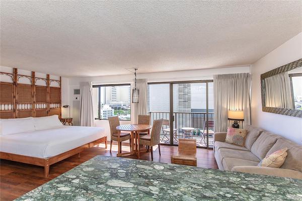 世界的に有名なワイキキビーチや、数多くのレストラン、ショッピングにも近く、アラモアナ方面に行くためのバス停も目の前にある「フォーパドル」のスタジオ物件。月々の管理費に、電気、セントラルエアコン、ケーブルテレビ、温水、上下水道の代金が含まれている点もおすすめポイントです。