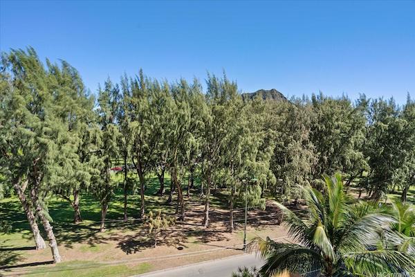 近すぎてダイヤモンドヘッドの全貌が見えないほどの距離感です。目の前に広がるカピオラニ公園沿いのアイアンウッドの樹々越しに壮麗なダイヤモンドヘッドの頂を見ることができます。