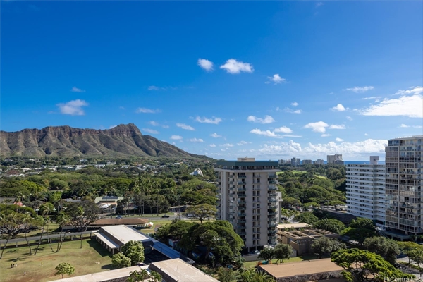 ワイキキサンセットは、ワイキキの東側ダイヤモンドヘッド寄り。ビーチまでの距離も近く、ご覧のようにダイヤモンドヘッドの全貌が眺められる絶好ロケーションにあります。ホノルル動物園や、カピオラニ公園なども徒歩圏、交通量も少なめな通りに面しているため、ワイキキ内では比較的静かなエリアです。