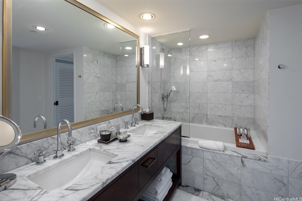 オーシャンビューがない9階のスタジオユニット。とはいえ、約40平米もあり、しっかりしたキッチン、バスルームや深いバスタブなどの豪華な仕様です。夢の”ホテル暮らし”のイメージはこんな感じを思い浮かべる人も多いのでは。