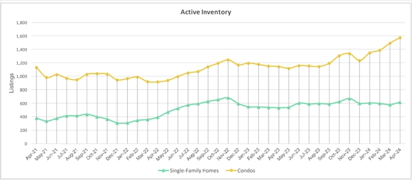 戸建て住宅の中間価格は$1,100,000となり、前年同月比では10%の増加を示した。コンドミニアムの中央値価格は前年同月比で$528,000となり、2023年4月の$500,000から5.6%増加し、いずれも上昇を見せた。