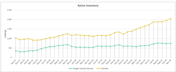 11月末時点での在庫は、戸建てが749件、コンドミニアムが2,049件。前年同月と比較すると、戸建ての在庫は11.5%増加し、コンドミニアムの在庫は53.3%増加している。
