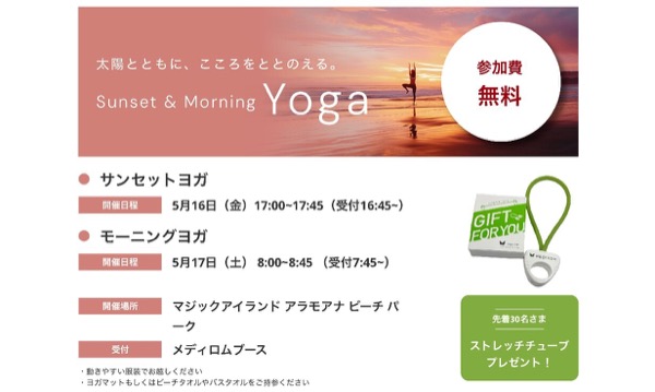 最後は17:00~17:45(メディロムのブースにて受付:16:45~)、メインスポンサーであるメディロムによる”Sunsetヨガストレッチ”で、気持ちよく1日を締めくくりましょう。また翌朝の5月17日土曜の朝にも、モーニングヨガ 5月17日(土)8:00~8:45(受付7:45~)が行われます。