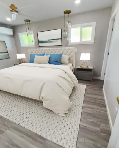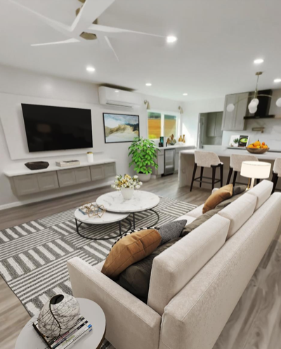 2024年リフォームされたこの邸宅、おしゃれなホワイトを基調としたインテリアで統一されています。リビングは、カウンターキッチンから大きなカウチエリアが仕切りなくレイアウト。大人はお料理をしたり、子供達は宿題をしたり、遊んだりと、どこにいても気配を感じられるオープンレイアウトです。