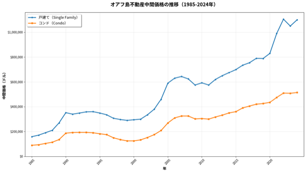 こちらはホノルル不動産協会のデータを元に作成した1985年から2025年現在までの中間価格の推移です。
