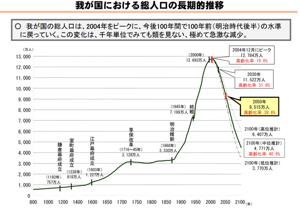 さらに深刻なのは将来予測です。日本の人口のピークは2004年、その後は減少の一途で、2050年には9515万人、2070年には7761万人、2100年には3700万人へと驚くほどの急カーブで下落していきます。出生率低下ペースは上がらず、65歳以上の高齢者の比率もどんどん高くなるという両輪で、人口減は過去の予測を上回るスピードで進んでいると言われています。