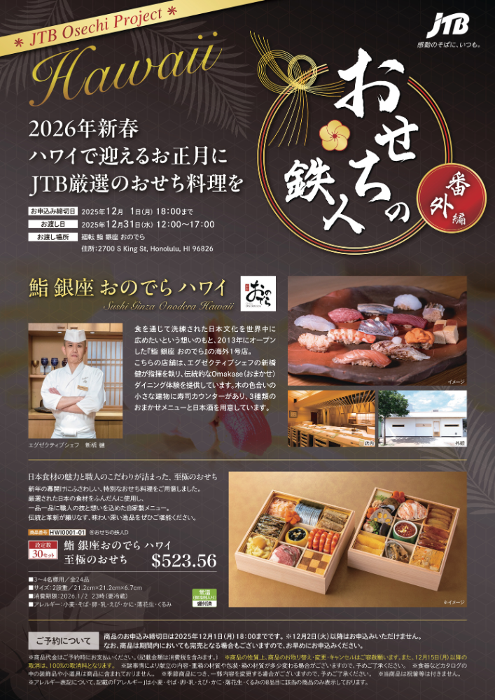 "JTB Osechi Project"として、このおのでらハワイ店のおせちを販売します。”至極のおせち”は限定30食($523.56)。一品一品に職人の技と思いを込めてつくりあげるおせちは、厳選された日本の食材をふんだんに使用した全24品となっています。
