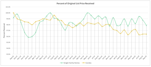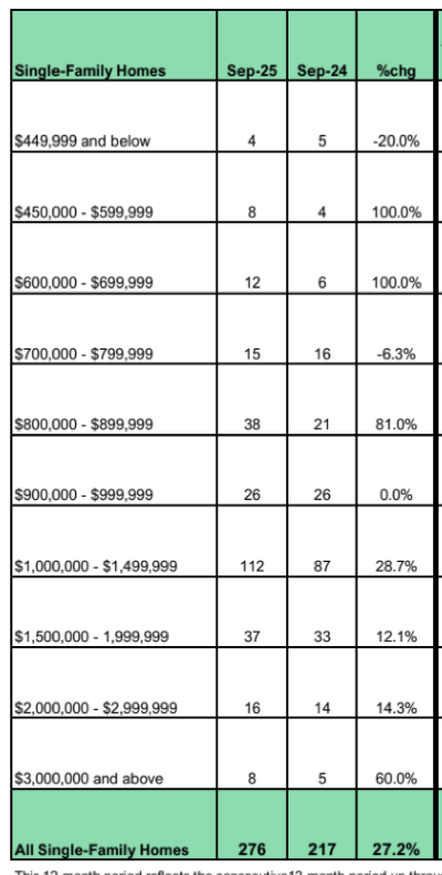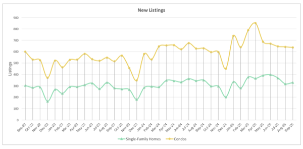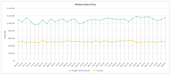 2025年9月の戸建て住宅の中間価格は1,155,000ドルで、前年同月の1,113,000ドルから3.8%の上昇を見せた。一方で、コンドミニアムは508,750ドルとなり、前年同月の517,500ドルから1.7%の下落となった。