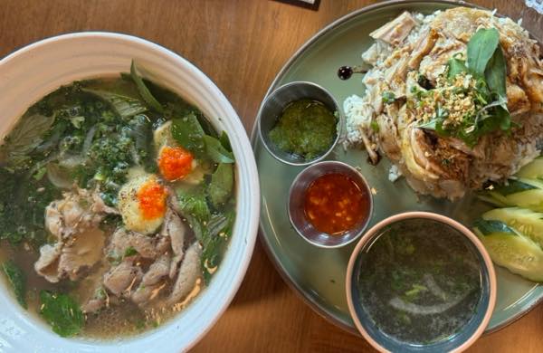 写真はシグネチャーメニューのフォー75($20.00)とハイナンチキン($23.00)。フォーは$12でオックステールを追加することもできる。