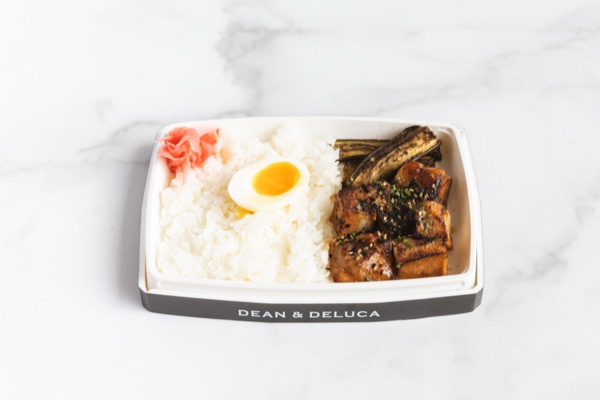 じっくり煮込んだ豚バラ肉を、香り高い味噌柚子ソースで絡め、軽く炙ってスモーキーな香りを添えたお弁当。 焼きナス、ワイアルア産のポーチドエッグ、プレミアムな七ツ星を使ったふっくらとした白米、紅生姜を添えた、バランスの良い一品。