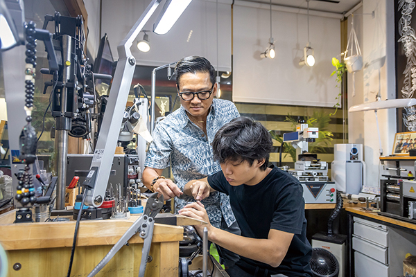 18歳からハワイアンジュエリーの卸売会社に入り、そこでジュエリーの基礎を学びました。同時に、職人やデザイナーの仕事をじっくり観察してどのようにハワイアンジュエリーができてゆくのかを理解しました。熟練職人に弟子入りさせてもらい修業を開始。テクニックをじっくり教えてもらいましたが、実は自分の中には実現したいデザインのイメージがすでにあったんです。やっぱりハワイの自然の美しさにインスパイアされた部分が多いです。あとはそれを具現化する技術を学べば良かった。