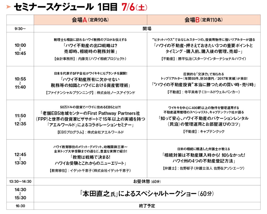 いずれもハワイのビジネスの第一線で活躍するプロフェッショナルたちが東京に結集する。ハワイへのロングステイや移住を考える場合に避けては通れない、ビザ、不動産、法律などの最新かつリアルな情報をまとめて収集出来るまたとないチャンスである。あなたのハワイ移住への夢を具体化し、実現への道のりを見通すためにも、ハワイ移住に興味がある方はぜひご参加下さい。