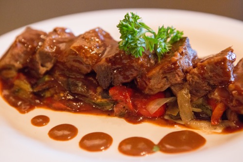 ゆっくりと煮込んだジューシーでやわらかいリブ。カベルネ・ボルドーのソースで。カリフォルニアナパバレーの赤ワインと一緒に。