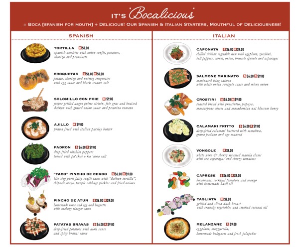 早速メニューをご紹介したいと思います。まず驚くのが価格!日本では普通かもしれませんが、ハワイでは珍しく均一価格の9ドル(メニューによってはスモールサイズは6ドルから)でスパニッシュ8種、イタリアン8種の合計16種のタパスを楽しむことができます!