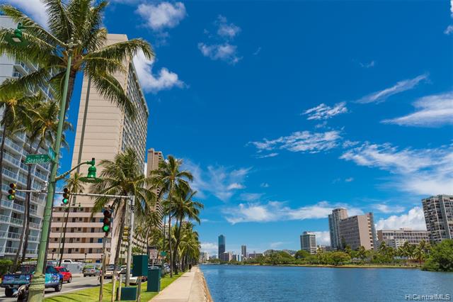 このコンドミニアムは築年数43年ですが、このユニットは全面改装されて真新しくキレイ。室内はバスルームも含め、床はウッドフローリングで統一されています。アラワイ運河に面したワイキキのコンドミニアムでは、山側に向いた窓から涼しい貿易風が吹き込むので、このお部屋は年間を通して涼しい、過ごしやすいユニット。ローカルの中には、山からの風が気持ちよく吹き降ろし、夜はオレンジ色のライトの夜景がきらめく山側ユニットを指名される人も多いそうです。