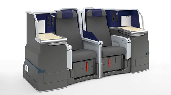 ビジネスクラスのシートは、全席通路とのアクセスを確保。フルフラットになるだけでなく、2席並びの「ペアシート」が新コンセプトのシートとして導入された。 2席の間の仕切りを下ろすとカップル席に。ハネムーンなどで人気が出そうだ。