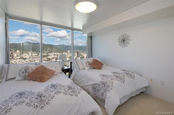 こちらのユニットも、リビングから、ダイヤモンドヘッドと海が見えるナイスビューのお部屋である。 ただし、リビングの正面は山側に向かって開いているので、夜は夜景が素晴らしく、また午後の強い日差しが直接入らないので年間を通して涼しく過ごせるメリットがある。