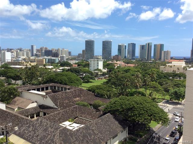 ユニットからは、遠くに海が見える、ホノルルのパノラミックビューが広がります。一番手前にある低層の屋根の建物は、ゴーギャンをはじめとする世界的芸術家の作品を所蔵するホノルル美術館です。その先には、クラフトフェアなども行われる公園・トーマススクエア、マッキンリー高校などが続くため、視界が開けていてビューは最高です!
