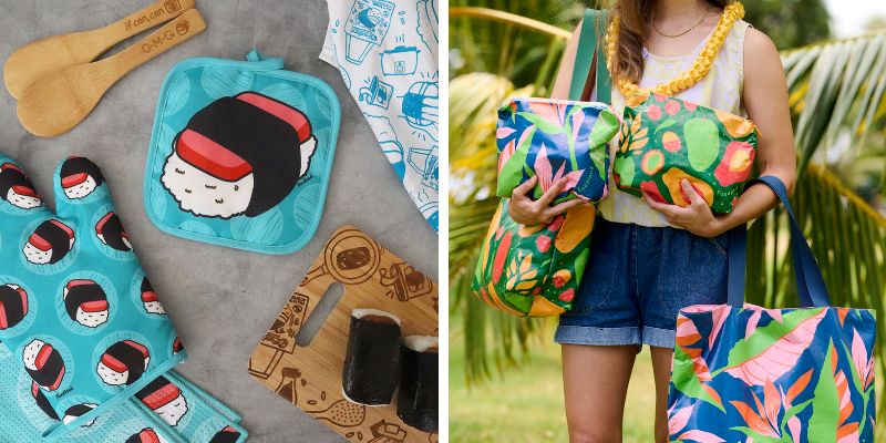 今回の新商品ラインには、ハワイの定番軽食をモチーフにした「スパムむすび柄」や、バードオブパラダイスの花柄、フルーツ柄などをあしらったエコバッグ、保冷ボトル、キッチンタオルなど、日用品として使いやすい商品が揃う。