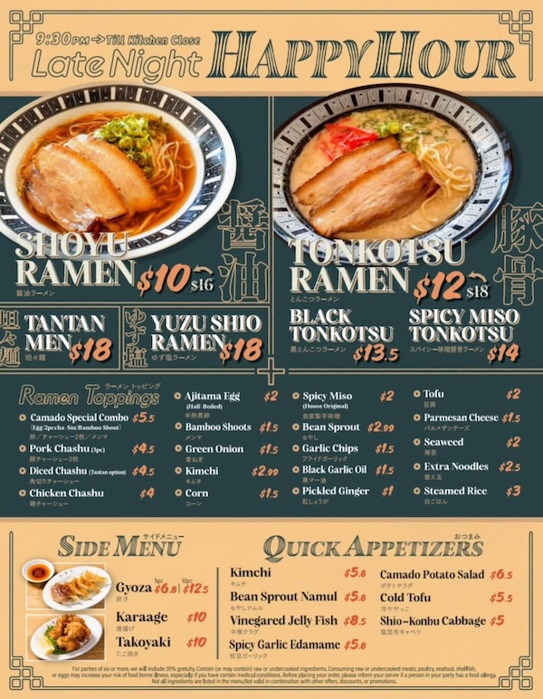 なお、人気の$10 ラーメンハッピーアワー(5:00–6:30 & 21:30〜閉店)は引き続き実施中。