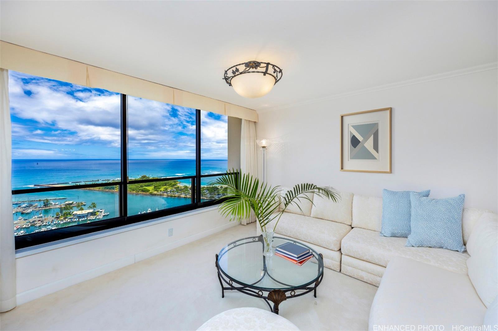Exceptionally Rare Opportunity: Coveted end-unit ocean view residence on the 39th floor of Yacht Harbor Towers' Diamond Head Tower. This 3-bedroom, 3-bath home enjoys unique vistas from Mauka to Makai, with panoramas stretching from the Koolau Mountains, to the Pacific Ocean, Ala Moana Beach Park, Coastline, Boat Harbor, as well as stunning Sunsets. Offering a sprawling 1,960 sq.ft. of living area, plus an additional 287 sq.ft. from the enclosed lanai, enjoy ample opportunities to customize the living spaces to your needs. Yacht Harbor Towers is positioned along the front-row of Ala Moana Boulevard, offering rare unobstructed views of paradise. This unrivaled location puts you between Ala Moana and Waikiki, putting near-endless options for dining, shopping, entertainment, water sports, and beach activities at your leisure. Well-managed, well-respected, and an icon along Honolulu's skyline, Yacht Harbor Towers residence is one you won't want to miss. Listing includes enhanced, virtually staged and zoomed-in photos.
