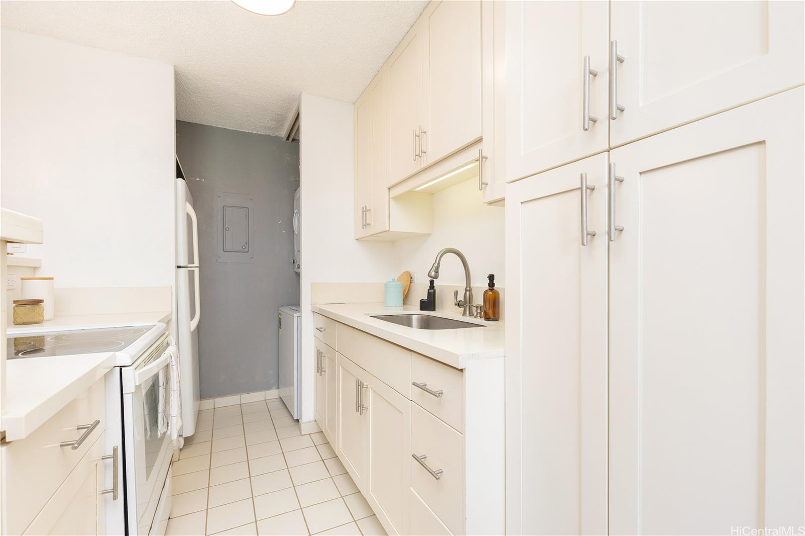 Enjoy the convenience of TWO parking stalls in Waikiki along with sweeping unobstructed views of the Ala Wai Golf Course, canal, and mountains from both the living room and primary bedroom. The updated kitchen features quartz countertops, white shaker cabinets, updated lighting and an in-unit washer and dryer. Monte Vista is a secured building with fob access, a gated garage, and amenities including a pool and BBQ area. All of Waikiki's best beaches, dining, shopping and more are just minutes away!